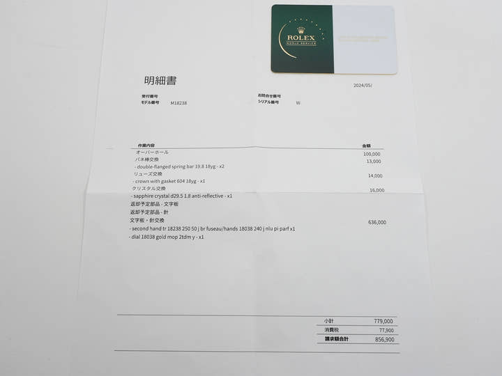 accessories | International service warranty; box; booklet; invoice; dial, hands |